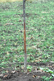 I noticed when training these young trees that fast growth rate promoted the development of stalked buds (buds on the ends of stem like projections) in the upper portion of the tree. By mid-summer these stalked buds were all starting to sprout and I had to remove all of these new shoots to maintain a strong central leader. Leaving a stalked bud to grow is a big mistake, because the branch that forms from this bud will produce a branch attachment like the bad one pictured above-left. By pruning off the stalked buds, I forced the tree the sprout from secondary buds the following spring. When these buds grow they tend to make great branch attachment unions. In the case of my Kanza tree, it looks like I missed a stalked bud early in the life of my tree. This problem branch will not be a problem much longer--I'll be removing this branch early next spring.