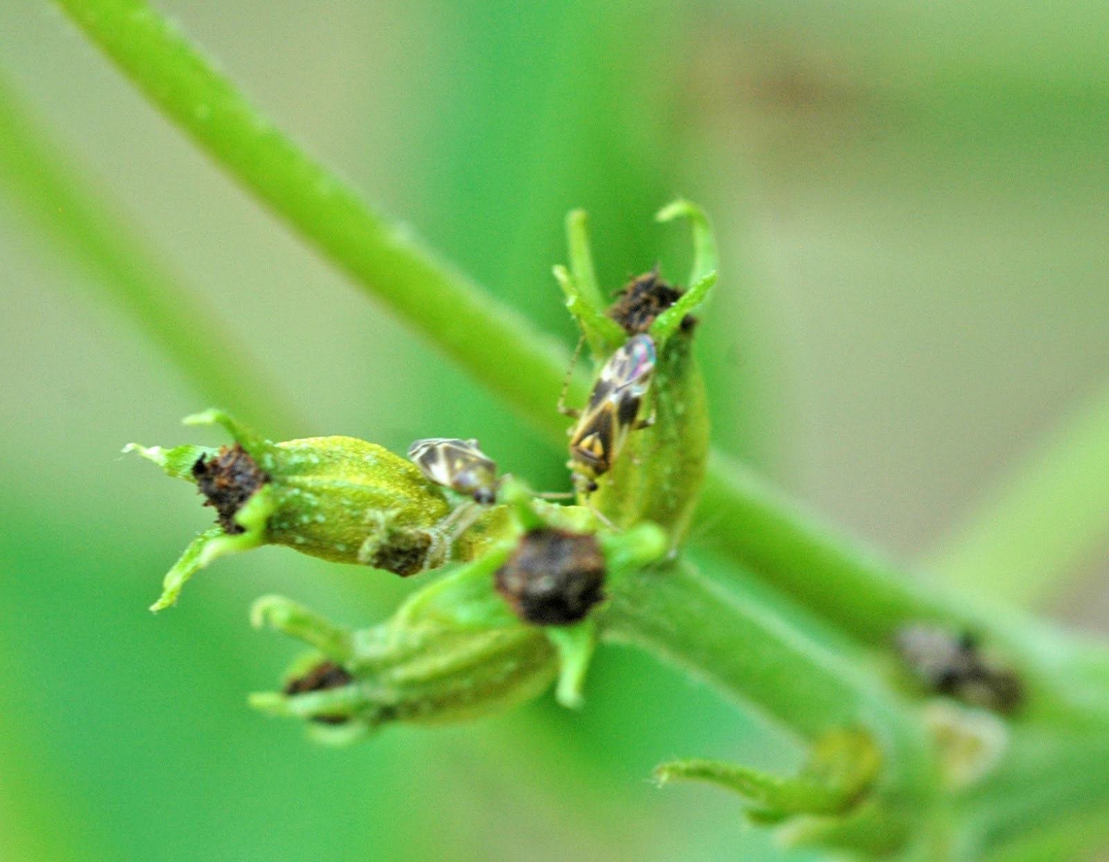 At this time of year I like to check on the progress of pecan flowering. While inspecting pistillate flowers, I always spot numerous plant-feeding Mirids crawling around young nutlets. In the photo at right, note the two, mottled-brown insects on the flower cluster. These are examples of the Mirid, Plagiognathus caryae. In the photo, they are using their piercing-sucking mouthparts to feed on plant juices.These insects can also be seen feeding on catkins and expanding leaves. Although they look like they could be damaging, we have found that these insects do not cause significant crop losses.
