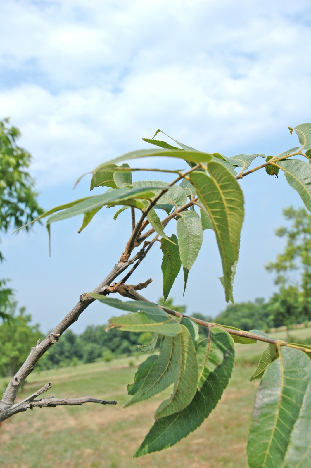 As you might recall, I am growing a bunch of pecan seedlings in containers this summer. As my seedlings germinated, the first leaves produced by the new trees had a single blade; very different than the normal compound leaves we see growing on pecan. Now my seedling trees have grown taller they are starting to produce compound leaves (photo at right). The first compound leaf has a large terminal leaflet with only two small leaflets below. Above that, another compound leaf is starting to grow and expand. This leaf will have five leaflets.
