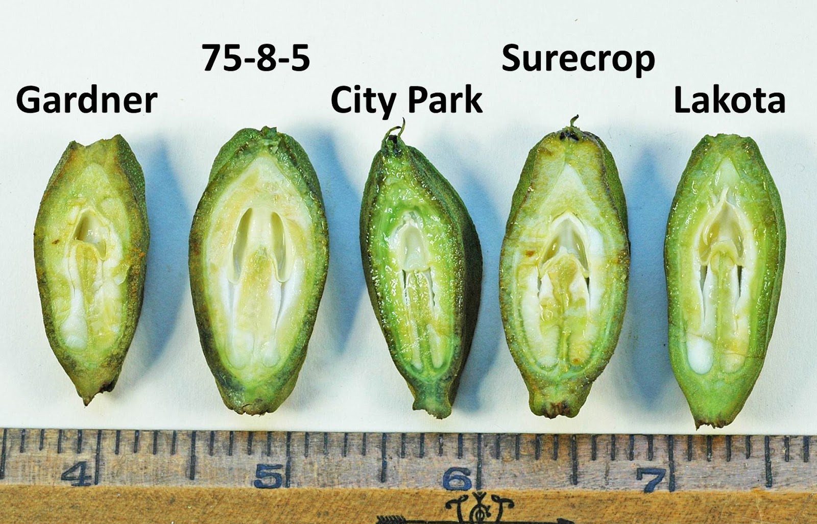 I cut these nuts open to check on kernel development and allow me to compare this second set of nuts with the first. USDA 75-8-5 had the largest kernel growing to 1/4 water stage. Surecrop, Lakota, and Gardner (sorry for the bad cut on Gardner) were all in the large heart stage. City Park was just approaching the small heart stage.