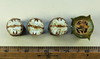 The cluster pictured above yielded four nuts (photo at left). Three of the nuts were easily removed from split shucks. The forth was tightly held inside a green shuck.